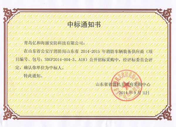 山東省省級機關政府采購中心就山東省2014-2015年消防器材裝備供應商項目在國內進行招標采購,經審定,億和海麗研發生產的安心牌消防輕型安全繩、安心牌消防通用安全繩完全符合要求,2014年9月評標委員會授予青島億和海麗安防科技有限公司為山東省公安廳消防局及所轄部隊提供中標產品的資格。