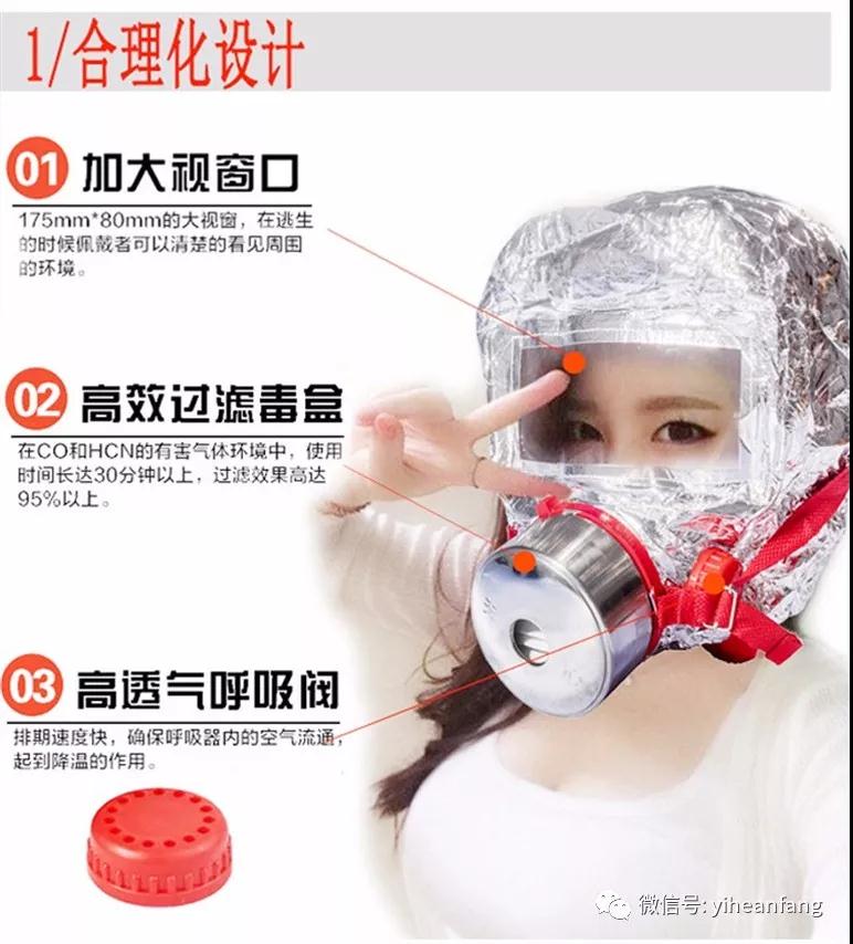 發生火災時,佩戴“海麗安心”過濾式消防自救呼吸器,可通過過濾裝置吸附、吸收、催化及直接過濾去除一氧化碳、煙霧等有害氣體,保證人員的生命安全。